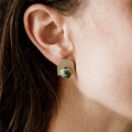 The model is wearing these earrings in brass.